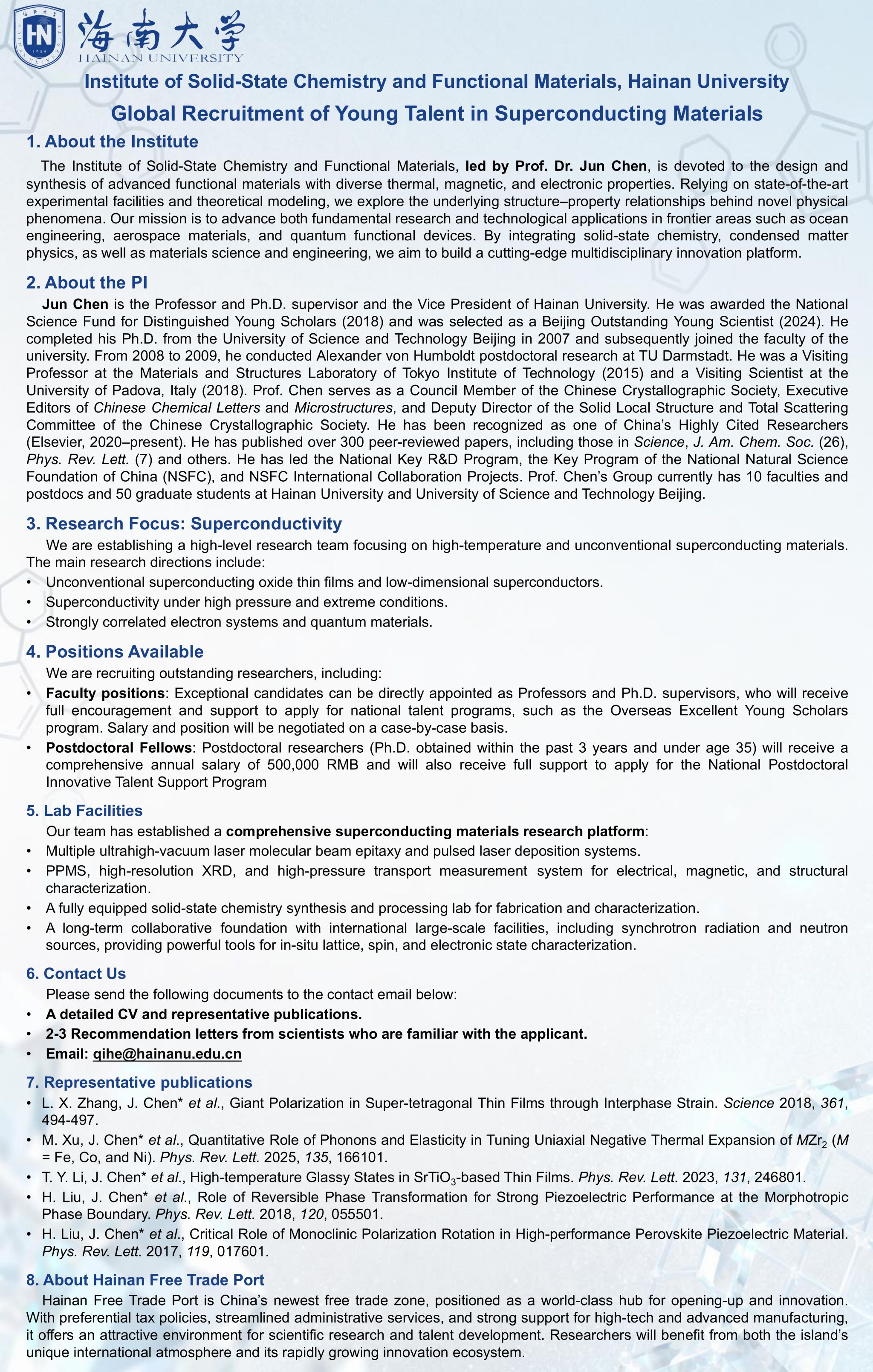 Institute of Solid-State Chemistry and Functional Materials, Hainan University Global Recruitment of Young Talent in Superconducting Materials